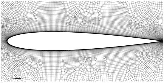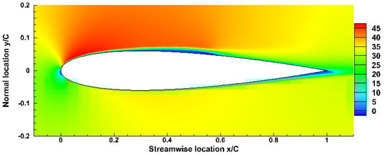 The free stream Mach number 0.1 corresponds to a velocity magnitude of 34.3 m/s. The aerofoil is inclined at 4 degrees, resulting in a velocity vector of . A fixed-inlet boundary condition is imposed at the inlet and a convective boundary condition is applied at the outlet. A non-slip condition is applied at the aerofoil surface. The Neumann condition (zero-pressure gradient) is used for the pressure at the inlet and the aerofoil surface, while at the outlet, the pressure value is fixed at 0. Finally, a periodic boundary condition is applied for faces in the span-wise direction. A steady-state RANS simulation with a Spalart–Allmaras turbulence model is run for 500 iterations to obtain a more converged initial field, as it also helps reduce the time needed to obtain statistically converged results for later analysis []. From the initialized field, LES is run for a period of time units , corresponding to a physical time of 0.7 s. The time-step of s is defined to capture the Kolmogorove time scale, as discussed in the previous study []. The obtained CFL number is less than 1.5 in the boundary layer region. In total, 70,000 iterations are needed for 24; the data are collected and averaged for the last 12 after the initial transient period. The statical convergence is reached after 10.