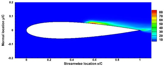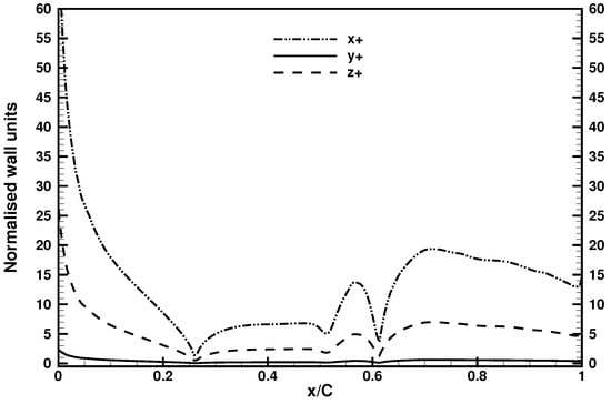 Due to the previously mentioned complex physics along the surface of aerofoil, an accurate representation of the near-wall structures is essential; therefore, a well-refined grid at the wall must be adopted. Here, the first cell height y is set to 0.00012 C, with an expansion rate of 1.1 for the following cells in the wall-normal direction; 150 cells are equally distributed in the span-wise direction, resulting in an averaged z = 0.0013 C. The averaged cell length in the stream-wise direction = 0.0036 C, where the minimum value is 0.0005 C at the leading edge and the trailing edge. The computed values for , , and along the upper surface of the aerofoil are plotted in Figure 3. Apart from a tiny portion of being slightly higher than 1 at near the leading edge, the overall value remains under 0.9 and approximately equals 0.5 in the separation region. The slightly excessive value does not affect the results []. The average value is less than 20 for most of the area and is below 9. The current wall resolutions are comparable to the wall-resolved LES determined by Asada and Kawai []. Piomelli and Balaras [] and Piomelli [] extensively discussed the grid requirements for wall-resolved LES; they estimated that grid resolution at the wall should be in the range of 50∽150 in the stream-wise direction, less than 2 in the wall-normal direction, and 15∽40 in the span-wise direction. The current wall resolutions should be considered sufficiently fine, and these parameters are displayed in Table 2 with high-fidelity references. It is also worth mentioning that the total number of cells is far less than that of DNS references [,,] since the current numerical framework (LES) does not fully resolve all the scales of motion of the field, and the grid cells are much coarser in the laminar region away from the aerofoil surface.