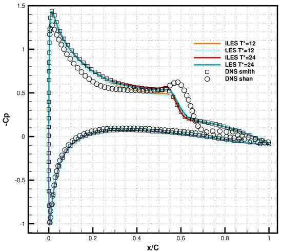 The distribution of the mean pressure coefficient along the aerofoil surface is displayed in Figure 4, including the DNS data from Shan et al. [] and Smith and Ventikos []. From the leading edge to approximately x/C = 0.2, the pressure gradually increases towards the downstream direction, generating an adverse pressure gradient (∂p/∂x > 0), which causes the boundary layer to separate from the upper surface. A flattened plateau (0.3 < x/C < 0.53) denotes the laminar region of the separation zone, followed by a stronger second adverse pressure gradient (∂p/∂x > 0), where the separated boundary layer undergoes a transition to turbulence (0.53 < x/C < 0.6). The current observations are found to be similar to the flat plate case [,] and consistent with other LES investigations on aerofoil [,,]. A noticeable variation in mean values obtained in different averaging periods () can be observed in the laminar separation zone (0.2 < x/C < 0.65), revealing that the size of the separation bubble is related to the simulation time. Overall, the mean pressure coefficients ( = 24) from the current iLES and LES are in good agreement with the DNS presented by Smith [], while in the transitional and turbulent region (0.55 < x/C < 0.65), the iLES predicted a more consistent pressure distribution. However, evident disagreement is found when comparing these results to the DNS presented by Shan et al. []. The pressure increased faster downstream of the leading edge, and a much greater “bump” appeared in the transition zone; then, an under-predicted pressure was predicted near the trailing edge zone.