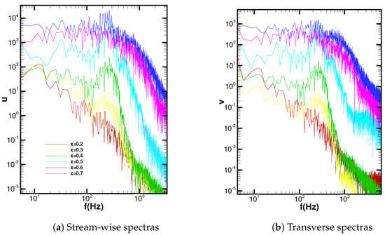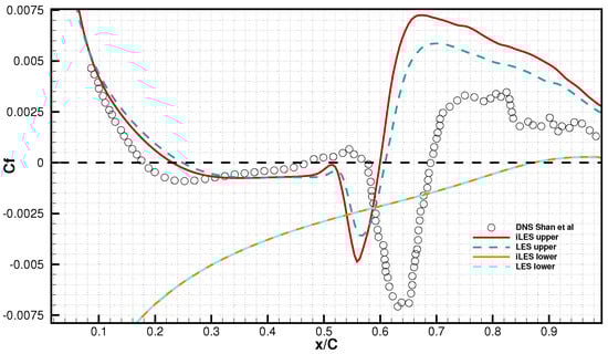 Skin friction has been assessed in many previous studies as an indicator of flow status; for instance, vanishing wall shear stress is the result of flow separation. The current mean values are plotted in Figure 5 and compared with the DNS results from Shan et al. []. The mean separation zone is estimated by zero crossings of the mean skin friction coefficient with a length of 0.36 C, where the mean separation location and mean re-attachment locations lie approximately at x = 0.24 C and x = 0.60 C, respectively. The current re-attachment location for LES and iLES is very close to that of the DNS from Smith [], who predicted a mean re-attachment at x = 0.56 C; however, according to the DNS results of Shan et al. [], the flow re-attached at a further downstream location, x = 0.68 C, and a much longer separation bubble with a length of 0.49 C was obtained. It was pointed out that the size of the separation bubble is related to time because of the large-scale oscillations in the three-dimensional flow []. Note that the simulations were run for a duration of 24 time units and 30 time units for both Smith [] and Shan et al. []; thus, the reason for the disagreement should exclude time convergence. It is worth mentioning that the negative skin coefficients in the plots indicating the boundary-layer separation and should always remain negative until the re-attachment further downstream.