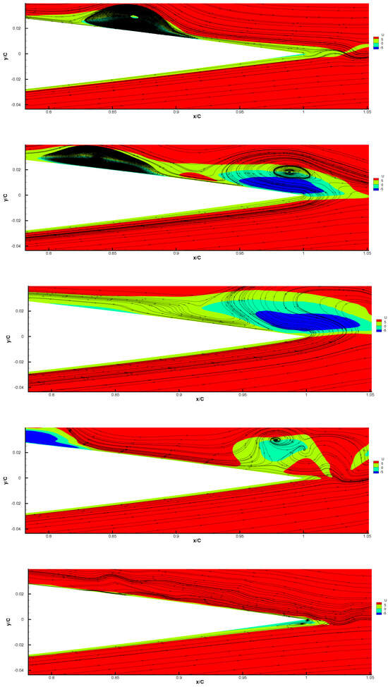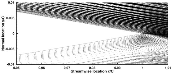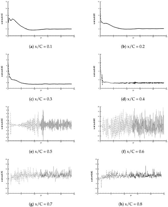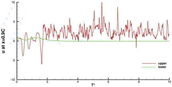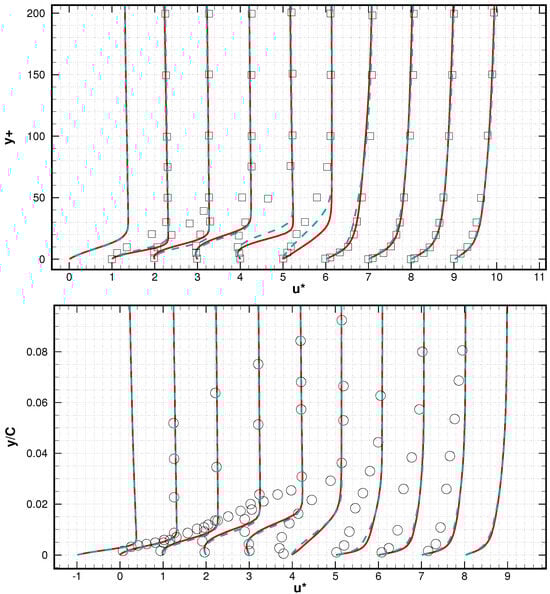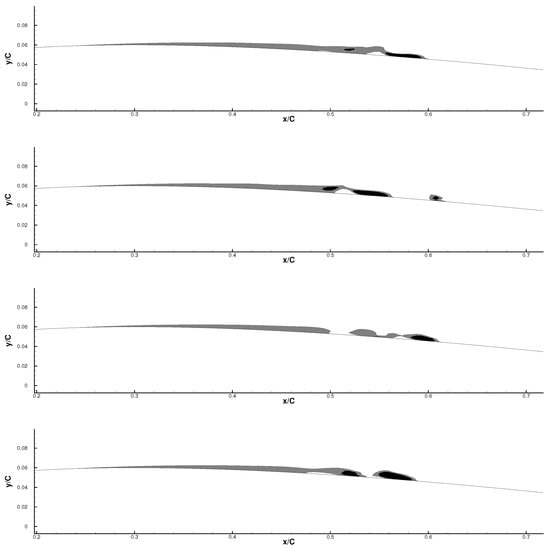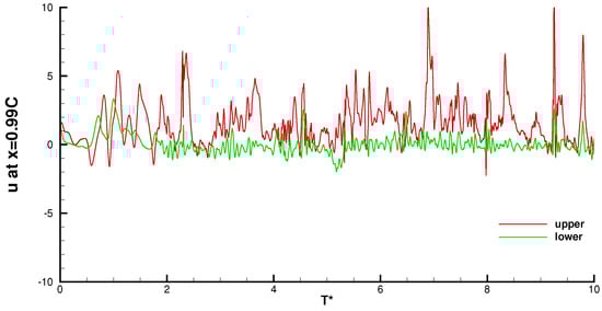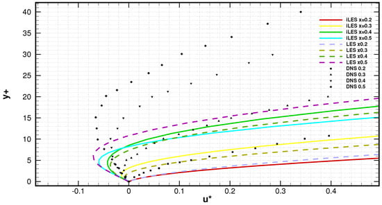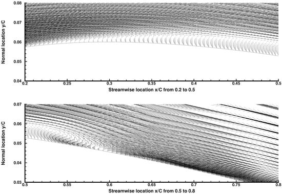 At around x = 0.5 C, a slight recovery followed by a negative surge immediately occurred, indicating the onset of a transition which agrees qualitatively with that from Spalart and Strelets [] and Alam and Sandham []. On the other hand, a recovery to positive values was obtained by Shan et al. [] in the middle of the separation zone, due to an additional thin layer of the mean flow near the wall in the stream-wise direction under the reversed flow. The accurate representation of the boundary-layer development is therefore in doubt as this thin layer was not observed in various other high-fidelity simulations, either [,,,,]. At location x = 0.58 C, a negative peak was reached by the current simulations; then, they recovered towards a positive value rapidly, indicating the end of the laminar transition to the turbulent boundary layer. After the re-attachment at x = 0.6 C, the skin friction coefficient continued to increase to a higher positive value quickly, then gradually dropping down. The DNS from Shan et al. [] showed a similar trend, apart from a largely delayed transition, re-attachment, and an “oscillated” post-attachment. On the lower surface, the computed skin friction coefficients are non-distinguishable from those of the current iLES and LES; additionally, the flow remains laminar and attached for most of the cord length. The separation occurs at a location near the trailing edge, which is explored in a later section.