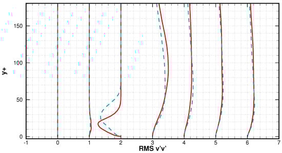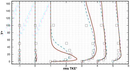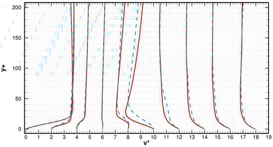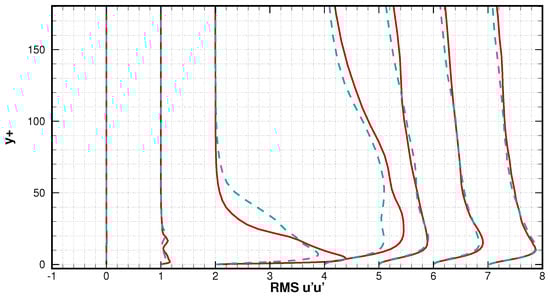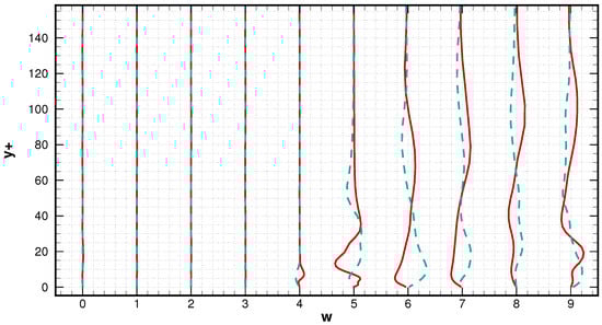 The details regarding computational cost are summarized in Table 3. A total of 128 CPUs were used for each simulation, half of those used for DNS case D []. The amount of CPU hours required to carry out the necessary simulation steps is significantly lower for current iLES and LES; however, the iLES based on the third-order WENO scheme is almost twice more expensive than the LES based on the WALE SGS model. It should be noted that approximately 3100 s was allocated to the calculation of the smooth indicator matrix for the WENO scheme and in addition to general storage. Additionally, the third-order WENO scheme requires an extra 400 G for storing matrix coefficients in order to accelerate the reconstruction process []. Thus, the third-order WENO-based iLES is generally more expensive than the WALE-based conventional LES.