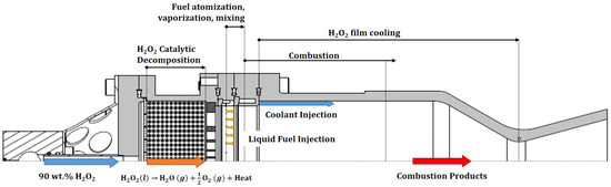 Figure 1 illustrates the operational concept of the H2O2/HC bipropellant thruster. Liquid hydrogen peroxide is first injected into the catalyst reactor, where it is catalytically decomposed into the gaseous products of hot oxygen gas and water vapor. The liquid fuel is then injected into the product gas and undergoes breakup processes of atomization, vaporization, and mixing. As the mixture gas is well above the auto-ignition temperature, the combustion process occurs spontaneously. The combustion product gas travels through the nozzle and creates thrust.