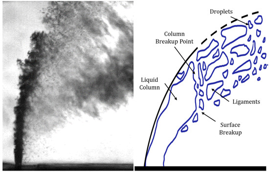 High-speed image (left) and schematic diagram (right) of liquid jet in crossflow.