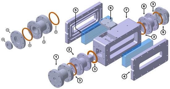 Parts breakdown of the H2O2/Kerosene bipropellant thruster (1: catalyst reactor; 2: connector; 3: copper gasket; 4: exterior flange; 5: quartz window; 6: fuel injector; 7: combustion chamber; 8: connector; 9: nozzle; 10: pipe connector; 11: injector flange; 12: catalyst bed).
