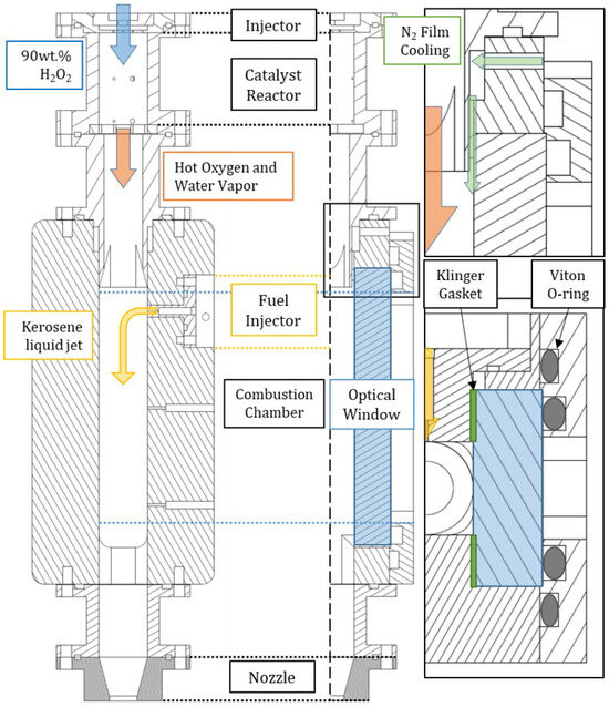 - Sisco, J.; Mok, J.; Austin, B.; Anderson, W. Autoignition of Kerosene by Decomposed Peroxide in a Dump Combustor Configuration. In Proceedings of the 39th AIAA/ASME/SAE/ASEE Joint Propulsion Conference and Exhibit, Huntsville, AL, USA, 20–23 July 2003; Volume 21. [Google Scholar] [CrossRef]