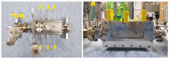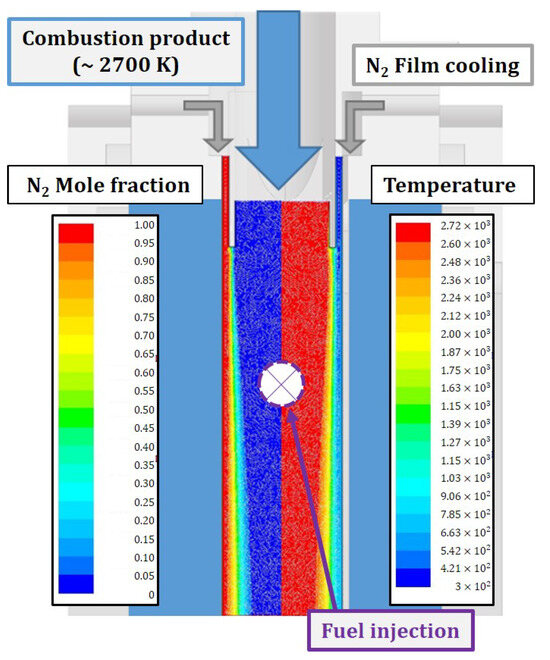 Before the bi-mode hot fire tests commenced, a preliminary test campaign was executed using a series of dummy windows to define the operating conditions of the N2 gas film cooling system. Two dummy walls, each 15 mm thick and made of stainless steel, were equipped with thermocouples extending to the interior surface of the combustion chamber, as illustrated in Figure 13. Subsequently, the N2 injection pressure required to establish a gas mass flow rate adequate to prevent window overheating was iteratively examined.