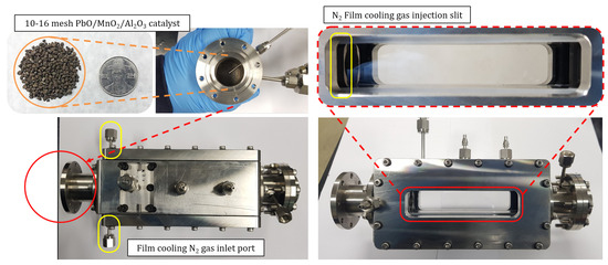 As illustrated in Figure 3 and Figure 4, a singular circular orifice fuel injector with an orifice diameter of 0.564 mm was positioned downstream from the catalytic reactor. The design did not incorporate a rearward-facing step for flame holding to eliminate any potential impact of flow recirculation on the LJICF phenomenon. On each side of the combustion chamber, two optical windows, each 15 mm thick and crafted from NC-200 quartz, were installed and sealed using Klinger gaskets and Viton o-rings. The flexibility of these sealing components mitigated structural vibrations on the windows, thereby reducing the risk of cracks. Between the catalytic reactor and the combustion chamber, a connector was installed with a 1 mm thick slot on both sides for film cooling N2 gas injection.