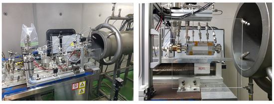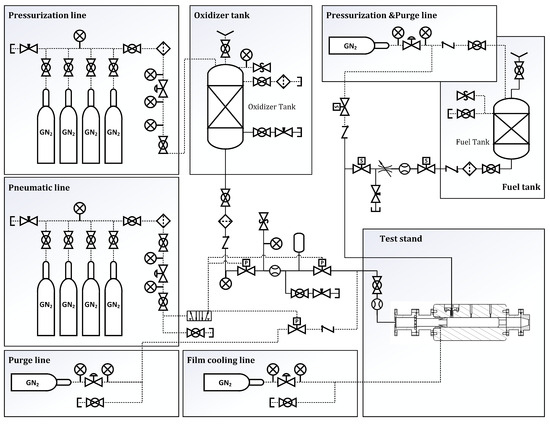 A schematic diagram of the propellant feeding system and an actual image of the experimental setup are shown in Figure 7 and Figure 8, respectively. The tanks of each propellant are pressurized by a high-pressure N2 gas. The flow of the propellants was controlled using pneumatic and solenoid valves. The temperature and pressure data were acquired at a rate of 40,000 samples and 80 samples per second, respectively, using a data acquisition system (Chassis: SCXI-1000; Voltage module: SCXI-1120 with SCXI-1320 terminal; Thermocouple module: SCXI-1112, National Instruments Corporation, Austin, TX, USA) equipped with the LabVIEW program. K-type thermocouples (Omega Engineering Inc., Norwalk, CT, USA) and pressure transducers (Sensys Inc., Ansan, Republic of Korea, and Kulite Inc., Leonia, NJ, USA) were used to measure temperature and pressure. The mass flow rate of the propellants was obtained utilizing the orifice plate differential pressure mass flow meter.