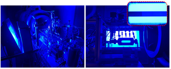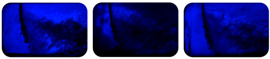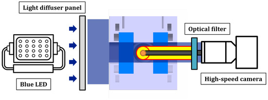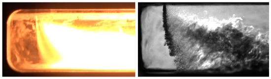 In this study, the backlit shadowgraph technique with chemiluminescence suppression was used to visualize the LJICF phenomenon. Shadowgraph is an optical method that reveals the nonuniformities of media. As the liquid mostly blocks the transmission of light, it is possible to effectively distinguish and detect the liquid jet from gaseous crossflow. Additionally, to acquire a clear image, it is necessary to suppress the chemiluminescence generated by the combustion flame. The flame radiation spectrum for the oxygen–kerosene combustion process illustrated by Harrje et al. [22] reveals that the peak intensity of radiation occurs at wavelengths of approximately 300, 420, and 500 nm caused by OH, CH, and C2 radicals, respectively. It is impossible to block all flame radiation within the visible light spectrum due to the carbon continuum; however, it is possible to minimize the effect by filtering all but a narrow wavelength bandwidth of 450–500 nm. In this study, a high-power blue LED of 400–500 nm wavelength was used as a backlit illumination device. The light diffuser panel was mounted in front of the blue LED arrays to evenly distribute the intensity of the floodlight. A BP470 blue bandpass filter (Midwest Optical Systems Inc., Palatine, IL, USA) with a bandpass spectrum of 425–495 nm was used to filter combustion-induced chemiluminescence. As a result, the bandpass spectrum of 425–495 nm can be observed through the visualization setup. To obtain visual data, FASTCAM UX-100 (Photron Inc., Tyokyo, Japan) was used at 4000 frames per second, 1280 × 1024 resolution, and 1/200,000 shutter speed. The conceptual schematics of the shadowgraph visualization setup and the images from the test stand are shown in Figure 9 and Figure 10. A scale bar was inserted in the combustion chamber before the experiment to derive the actual spatial position of the liquid jet from the recorded images.