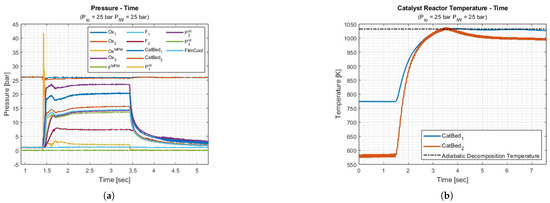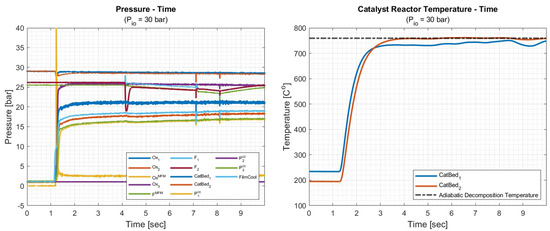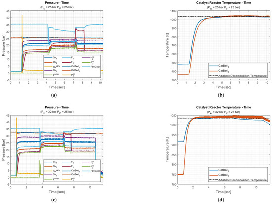 Figure 17 shows the pressure and temperature measurement data obtained from the fuel injection bi-mode operation with the oxidizer tank pressure of 25 bar (Figure 17a,b) and 32 bar (Figure 17c,d). Pressure at the combustion chamber changed following the operation sequence explained in Figure 14 and achieved a nominal value of 19–23 bar as designed without significant combustion instability. The temperature downstream of the catalytic reactor reached the adiabatic decomposition temperature of 90 wt.% hydrogen peroxide, indicating the complete decomposition of the injected liquid oxidizer.