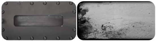 The validation of the H2O2/Kerosene bipropellant thruster, propellant feeding system, and visualization setup was initially carried out in mono-mode operation. During mono-mode, fuel was not introduced via the injector; solely liquid hydrogen peroxide was supplied to the catalyst reactor. The data presented in Figure 11 confirmed the success of the mono-mode test. In Figure 11a, pressure data were collected from 13 locations within the propulsion system, encompassing the tank pressures, feed lines, both mass flow meter (MFM) ports, the catalytic reactor, the combustion chamber, and the coolant injection port. To account for possible malfunctions of pressure transducers under extreme conditions, redundant observations were made for the combustion chamber pressure, as can be seen from the data of the . It was noted that a stable pressure in the combustion chamber was maintained at about 13 bar. Figure 11b indicates that the temperature downstream of the catalytic reactor () reached a near-perfect adiabatic decomposition temperature of 1050 K, with no leakage detected at the optical window. Due to the incomplete decomposition at the upstream of the reactor, () was observed to be lower than the adiabatic decomposition temperature. The window exhibited durability under mono-mode conditions even without the application of N2 gas film cooling, suggesting that thermal shock cracking can be prevented by keeping the internal surface temperature of the optical window below 1050 K. When N2 gas was introduced, water vapor from decomposition products condensed, reducing the visibility of the window, as depicted in Figure 12. However, this reduction in visibility was minimized during bi-mode operation with fuel injection, as the heat produced by the combustion flame effectively mitigated the condensation.