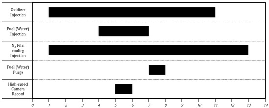 The bi-mode operation was conducted sequentially as depicted in Figure 14. As can be seen in the operation sequence, the bi-mode operation was gradually transitioned from and to the mono-mode to prevent sudden temperature changes, thus minimizing the risk of thermal shock cracking of the optical window. N2 gas film cooling was activated throughout the 10 s of oxidizer duration. The high-speed camera recorded the images for nearly 1 s (approximately 4000 images) during the 3-s bi-mode operation.
