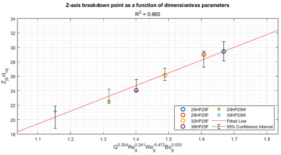 Nonlinear regression was performed to derive the empirical correlations of normalized jet breakup positions with the dimensionless parameters as expressed in Equation (4). Optimization processes were carried out using nonlinear regression using the MATLAB® Statistics toolbox to identify the five unknown parameters that best fit all datasets. The newly derived correlations indicated good agreement with experimental data with 0.965 and 0.927 as the coefficients of determination (). As can be seen in Figure 24 and Figure 25, the experimental measurements mostly sit within the 95 % confidence interval from the derived correlation.