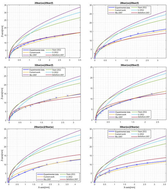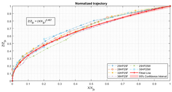 The normalized trajectories, which utilize breakup positions for each coordinate as normalizing factors, are applicable for evaluation across various operating conditions [13,25,26]. Figure 26 displays these normalized trajectories and their mean, alongside the empirical correlation formulated from the datasets. In this context, the correlation is presumed to follow a power law, which can be obtained as illustrated in Equation (5). Analogous to the earlier figures, the trajectories of the liquid jets identified in the experiments were assessed against the fitted correlation, which included a 95% confidence interval. It was found that the test cases performed during the latter stages of the test campaigns demonstrated a higher degree of error. This consistent trend is probably attributable to the challenge of precisely determining the liquid trajectories’ positions due to image disturbance from soot deposition.