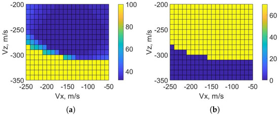 Figure 9a, the feasible region represents all the cases in which the MPC algorithm was able to overcome the initial velocity. When the initial magnitude of