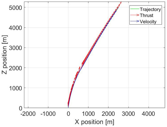 Figure 6 illustrates the trajectory followed by the RLV during the powered descent. The red vectors represent the thrust applied at each moment, with the largest thrust exerted at the start and end of the landing. This is further confirmed by