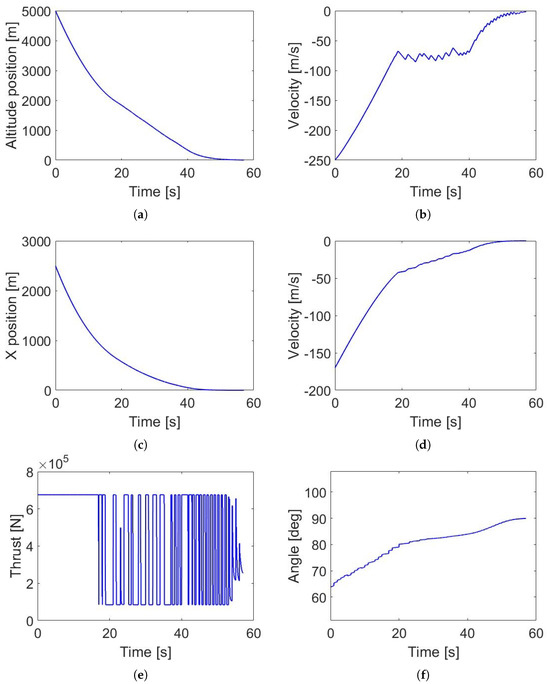 Figure 7e, the thrust follows a bang–bang profile, reaching its maximum for extended periods at both the beginning and end of the simulation. Meanwhile,