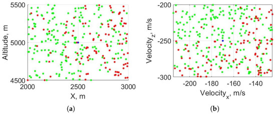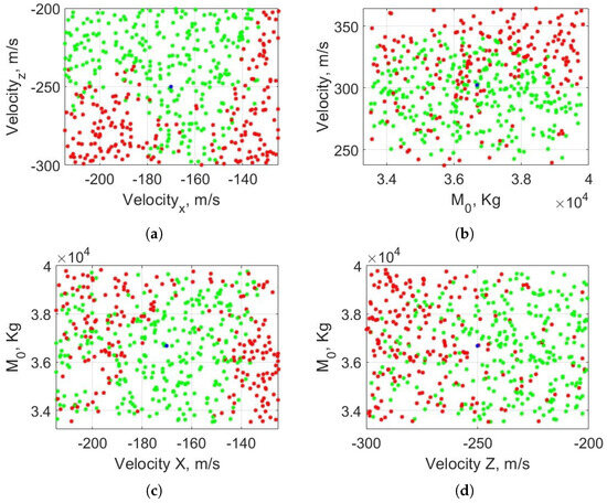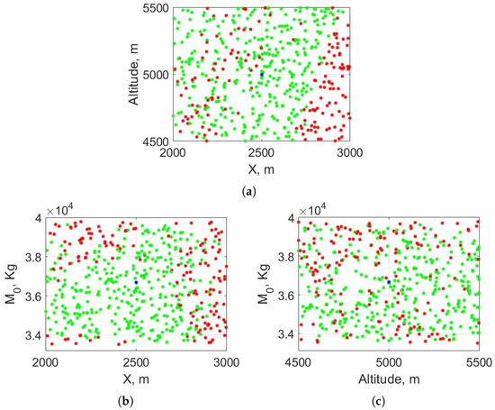 Figure 8b,c, the initial mass is compared to each position component. Analysing both subfigures, it can be seen that, for a fixed initial velocity, the component that affects the feasibility the most is