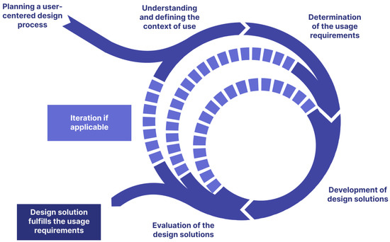 Since the requirements within the process of creating software for air traffic control change frequently [21], it makes sense to choose a workflow that remains flexible during the course of the project and allows for adjustments at any time. A frequently referenced design process in industrial design is “user-centred design”. This is based on DIN EN ISO 9241-210 [22], which addresses the user-centred design of products and software. The model, which can be adapted to the individual processes, provides six approaches for adapting a product to the user. This adaptation can lead to increasing user productivity, reducing the amount of training required, increasing usability and accessibility, improving the user experience and reducing stress. These approaches include understanding the user, tasks, and working environment, involving the user throughout the entire development and design process, continuously evaluating and adapting design solutions, providing for iterations, taking the user experience into account, and linking and simplifying interdisciplinary skills within the design team. In particular, the provision of iterations is repeatedly emphasised. The focus here is on the principles of usability in accordance with DIN EN ISO 9241-11 [23]: effectiveness, efficiency, and satisfaction. As depicted in Figure 3, user-centred design, just like the agile approach, is also based on an iterative procedure.