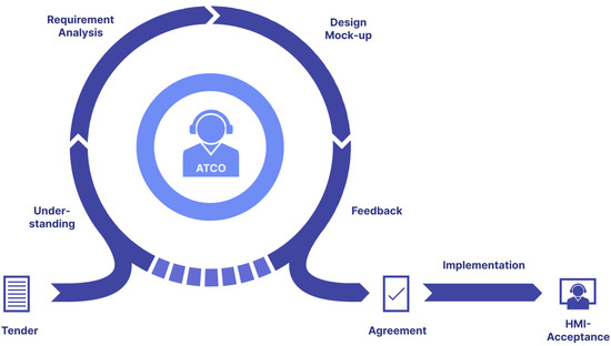 In the air traffic control context, it has been found that it is often difficult for users to communicate their mental model [24]. The way in which the user can be integrated into the project varies greatly depending on the use case and therefore there is no standard solution that explains how users can best be integrated. The iterative approach and the prioritization of the user often prove to be a challenge in practice. Every now and then, a clear step forward must be taken instead of another iteration loop in order to be able to implement clear results and keep development costs low [25]. Furthermore, the user cannot be constantly involved in the process. As almost all international air navigation service providers (ANSP) are currently suffering from a shortage of controllers and trainee controllers, ATCOs are not available in large numbers and are not constantly available for scientific research or extensive ANSP-internal developments [26,27]. As a result, the integration of the user must be well-prepared and thus quickly and easily accessible.