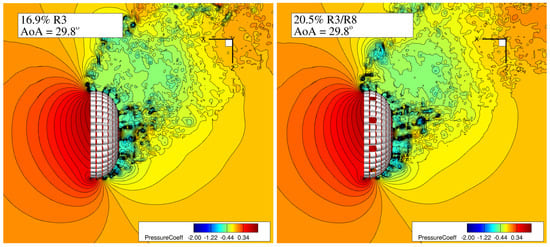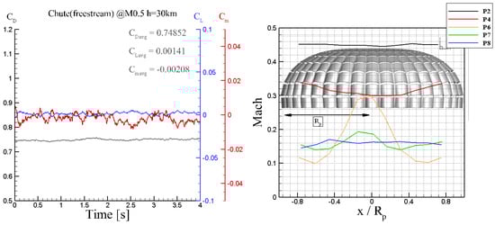 Table 1 summarizes the completed simulations. For clarity, the identifiers and are assigned to the cases with Mach 2.0 and Mach 0.5, respectively. The columns represented by , , and represent the standard deviations of the time histories used to compute the averaged drag, lift, and moment coefficients, respectively. The magnitude of and relative to their averages reflects not only the unsteadiness but also the relatively small contribution to the dynamics compared to the dominance of drag. This is indicative of the symmetry and stability of the ring–slot parachute design. The frequency f is a measure of the dominant component of the vortex shedding.