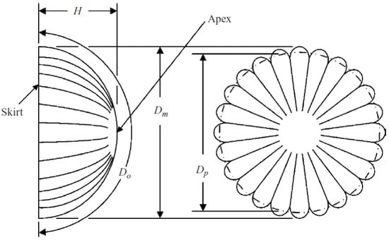 Several factors affect the integrated performance metrics, such as , , and , which characterize drag efficiency as well as static and dynamic stability for parachute–payload interaction analyses. Rigid models for the parachute coupled with independent 6-DoF dynamic modeling allow for a focus on the system flow fields related to variations in canopy and payload geometries, relative proximity of canopy and payload, Mach number (M), Reynolds number based on the parachute nominal diameter (), effective angle of attack , fluid density , and geometric porosity . However, several important factors not included in this analysis are related to parachute textile characteristics such as structural mechanical dynamics and fabric permeability, which can be modeled as an effective porosity , as done by Heinrich [7]. Finally, aerodynamic heating becomes an increasingly important consideration as the Mach number increases, especially beyond M > 5. For the current work, because the airspeed remains below the hypersonic cutoff, the heating associated with air compression and viscous dissipation of kinetic energy is not included in the analyses.