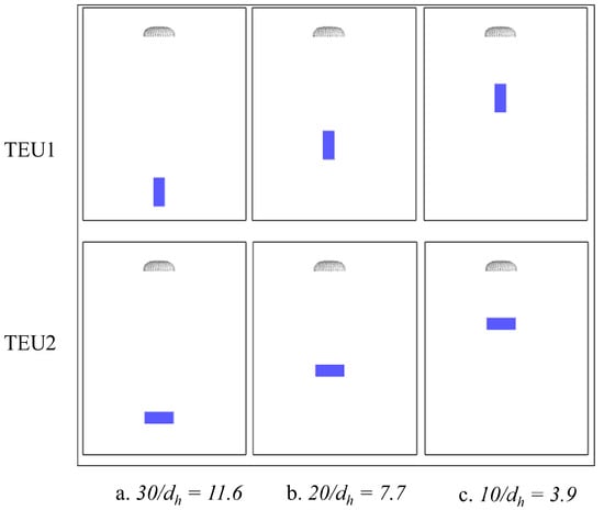 The chute geometry definitions are shown in Figure 5. The 8.53 m (=) ring–slot parachute (RS) model has a geometric porosity of , which correlates well with the range of the DGB parachutes discussed in Xue and Wen [6]. The ratio of the projected diameter to the nominal diameter is 0.775. The TEU is 6.06 m long, 2.44 m wide, and 2.59 m tall. The initial goal of the study was to compare the efficiency and stability of two different payload orientations for trailing distances between the payload and parachute based on predefined distances of m. Using the height of the TEU as the reference distance , Figure 6 denotes the simulated payload–parachute configurations. While this nondimensional definition permits analysis based on configuration, it does not correlate with the standard ratio definition of , where d represents the largest diameter. Alternatively, a comparison between the results of this article with respect to the standard definition would result in a ratio for the TEU2 configuration that needs to be defined using the length of the TEU such that and , respectively, for the TEU2 configuration.