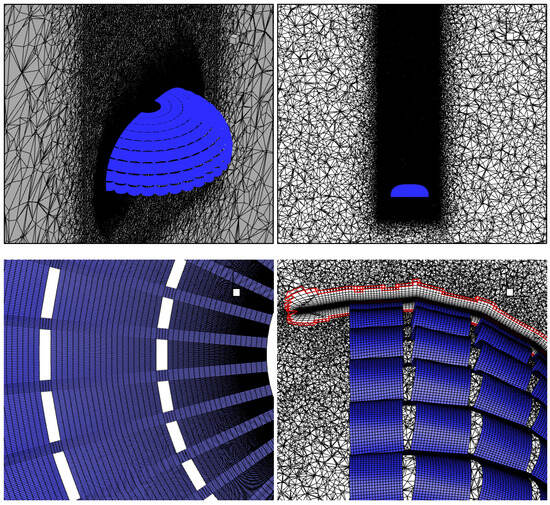 For detailed presentation of the meshing, numerical approach (including, turbulence models), time step, Newton sub-iterations, and temporal damping, the authors refer the reader to material in [9,16,22,23] and the references therein. This section highlights components of the simulation that are unique to the presented results, specifically the setup and orientation of the payload–parachute system and RANS grids used in the simulations.