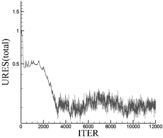 Several advanced-capability components of Kestrel were used during these simulations. The laminar equation set known as implicit Large Eddy Simulation (iLES) was employed for the simulations of the ring–slot-TEU system. The time step size (Ts) was set to 1 × 10−3 with 8000 startup iterations. The simulations were then run for 4000 iterations. The unsteady residuals are depicted in Figure 9.