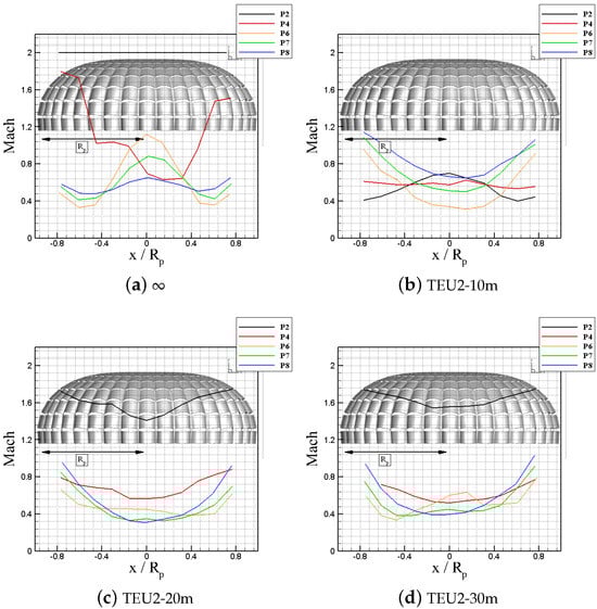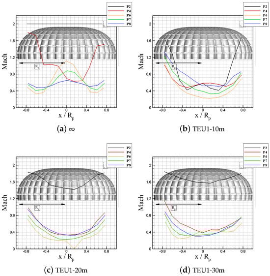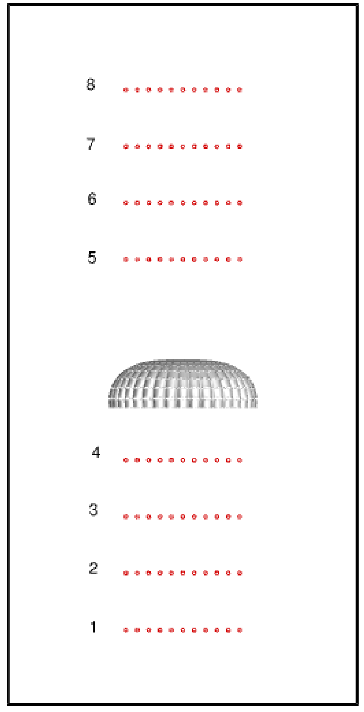 To assist with the analysis of the efficiency of the payload-parachute system, Figure 7 indicates the position of “tap” locations for interrogating the flow velocity to indicate the various wake deficits. Tap points were placed both upstream and downstream of the parachutes and their positions remained fixed across all simulation setups, making them independent of the distance between the payload and the chute. The tap points span a region of (where is the parachute’s projected diameter), with each row consisting of ten points spaced at intervals of . Upstream tap locations were positioned at , , , and . From the chute skirt, while downstream tap locations were situated at , , , and from the chute skirt.