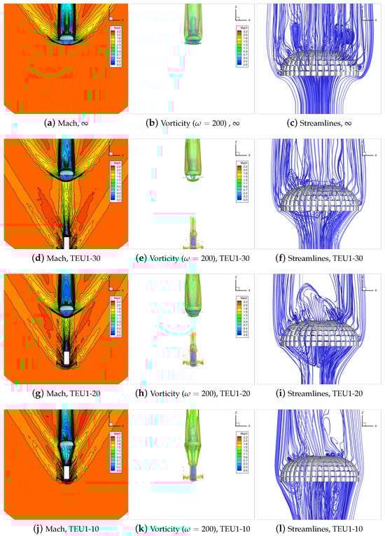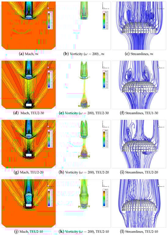This is a result of the payload wake being entrained when the payload–parachute separation distance is 10 m. The phenomenon is captured well in both the Mach contour and vorticity isosurface plots in Figure 13 and Figure 14. The vorticity values are in units of angular velocity. Note that small isosurface values tend to capture excessive flow details, including minor separated flow structures, while overly large values can miss critical flow features of interest. Selecting the appropriate isosurface value typically relies on experience and a trial-and-error approach. The figures also show the time-averaged streamlines, which seem to indicate some asymmetry in the flow fields for TEU1-10, TEU1-20, and TEU2-20.