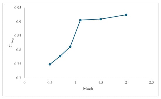 As part of the validation component of the project and also to predict canopy suitability for the operational application, a freestream Mach sweep through the trans-sonic region was conducted. The data for the rigid 8.53 m ring–slot canopy decelerator show an increase in (Figure 15), with a steep rise near . These data correlate very well with the drag variation of Disk–Gap Band (DGB) parachutes reported in Ewing et al. [12]. For the DGB tests, different forebodies were seen to have a significant magnitude affect in the resulting parachute due to the variation in wake deficit associated with each shape. However, in all cases there was a sharp rise and subsequent leveling of as the Mach number increased from less than 1 to 2. It is worth noting that this qualitative agreement only represents a preliminary validation reference, as many other factors associated with the parachute design also affect , including length of suspension lines, fabric permeability, Reynolds number, relative elasticity, and canopy stiffness.