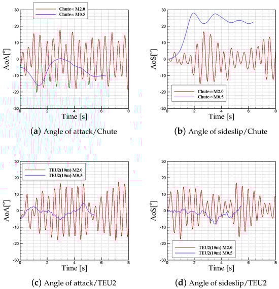 Angle of attack and sideslip angle time histories of chutes responding in freestream and in the presence of TEU2(10m) at M = 2 and M = 0.5. The chutes have a ball constraint at the moment reference point.