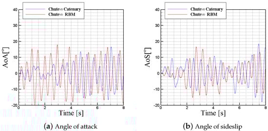 Angle of attack and sideslip angle time histories of chutes responding in freestream at M = 2 with and without cables. The chutes have a ball constraint at the moment reference point.
