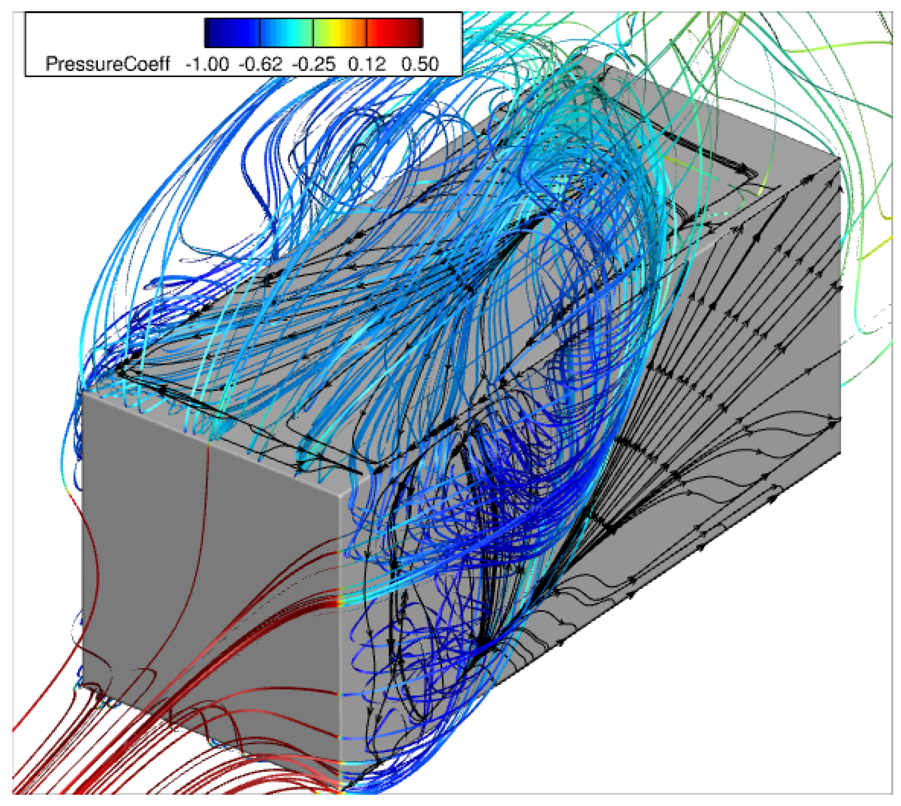 Figure 3 shows results from Benson et al. [16] depicting the integrated forces and moments as functions of the angle of attack. As with the parachute simulations, a rigorous V&V was conducted. Indeed, while many flow fields can support a given set of integrated metrics, the comparison of surface streamlines between experiment and simulations matches within the degree of uncertainty associated with the very small amount of wind tunnel angularity. Therefore, the volumetric flow field can be assumed to correlate equally well. Figure 4 illustrates the surface and volume streamlines for the condition with and M = 0.2.