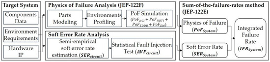 To support the reliability analysis techniques, various reliability analysis tools have been developed. These reliability models estimate the failure rate of integrated circuits (ICs) by collecting information on device components, environmental factors, or empirical data. However, these tools do not consider the internal characteristics of the device’s hardware intellectual property (HW IP) or the effects of space radiation [11,12]. This omission can lead to significant errors in reliability prediction for highly reliable electronic warfare systems. Therefore, it is essential to develop new modeling approaches that can effectively evaluate the reliability of systems operating at high altitudes.