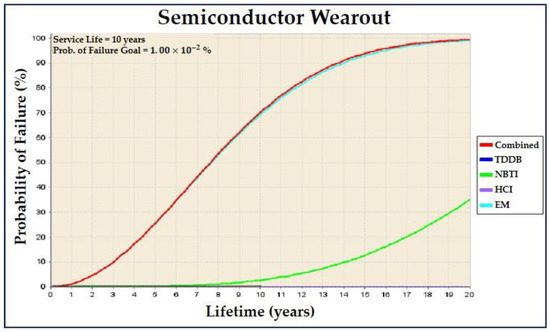 Second, during the simulation stage, wear-out analysis of the IC was conducted using the configured component model and temperature profile. External IC information and predefined environmental conditions were used. The simulation output generated four physics of failure rate values, which were aggregated to produce a graph depicting the failure probability over time, as shown in Figure 3.