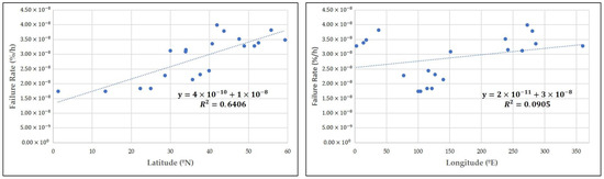 The integrated failure rate analysis provides a comprehensive assessment of the internal and external factors affecting the reliability of electronic components in a global operating environment. In this section, we examine the impact of cosmic radiation and the integrated failure rate based on key Earth operating environment parameters: latitude, longitude, and altitude. To this end, 20 major cities were selected based on their latitude, longitude, and altitude, and the soft error rate (SER) and integrated failure rate for each city were analyzed [56]. Information for each city is summarized in Appendix D.