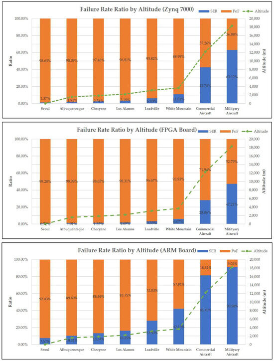 This section discusses the implications and validation of the integrated failure rate analysis. Section 4.3.1 describes SER and integrated failure rate analysis according to the Earth’s operating environment (latitude, longitude, and altitude). Section 4.3.2 evaluates the validity of the integrated failure rate analysis by comparing the Reliability and Mean Time To Failure (MTTF) values derived from our proposed analysis and existing reliability evaluation analysis with actual field data from avionics equipment.