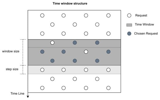 To reduce the computational complexity of the algorithm, this study employs the large-neighborhood search (LNS) algorithm proposed by Ribeiro et al. [] for efficient and rapid problem-solving. This utilizes a time window neighborhood structure, decomposing the problem into consecutive time windows for final resolution. Figure 1 illustrates the neighborhood structure of the time windows. In this diagram, the white nodes represent slot requests, and the interactions between adjacent time slot nodes are more significant during the slot allocation process. The algorithm groups nodes by selecting a specific time window for optimization. Additionally, to ensure the efficiency of slot allocation, the algorithm introduces an adaptive adjustment mechanism. The window size is denoted by s, and the window step size is represented by r.