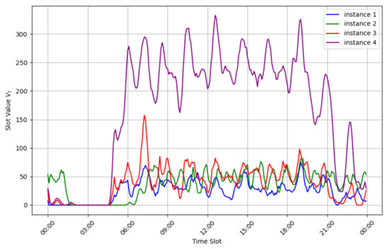 Figure 3 illustrates the distribution of time slot values based on demand across different time periods for four distinct instances. Although instances 1, 3, and 4 all pertain to Shanghai Hongqiao Airport, the calculated slot values differ due to variations in the input requests. However, a clear pattern emerges as the peak and trough trends in slot values are generally consistent across these three instances. In contrast, the time slot values for Urumqi Diwopu Airport exhibit a certain delay. For example, while the first peak at Hongqiao occurs between 6:00 and 8:00, the corresponding peak at Urumqi appears after 8:00. Additionally, Urumqi demonstrates stronger operational performance during nighttime hours compared to Hongqiao, with higher slot values between midnight and 2:00 AM, during which Hongqiao’s slot values remain relatively low. This phenomenon is likely attributable to time zone differences, which shift the operational hours at Diwopu to a later timeframe.