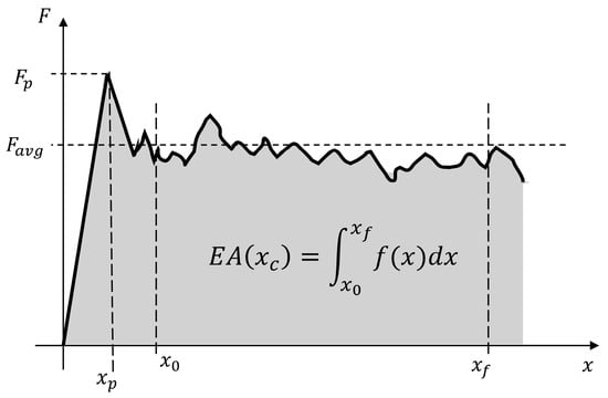 where and represent the initial and final crush displacement values considered for the calculation, is the total crushed distance (), and is the sustained crush force.