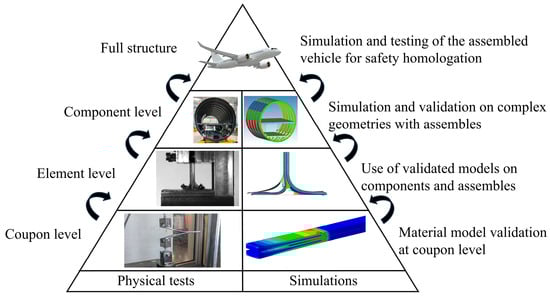 Experimental testing is essential for evaluating the crashworthiness of aerospace structures and ensuring the safety of the passengers during crash events. As specified in the previously discussed AMC 20-29 from the EASA, testing usually follows the “Building Block Approach”, visually represented as a pyramid (Figure 2). This approach usually integrates experimental tests with analytical/numerical methods and varies the level of complexity, starting from simpler coupons and elements and advancing to complex structures over time.