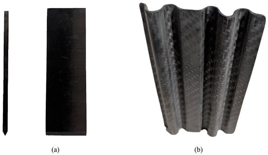 Conversely, self-supporting coupons are characterised by geometries that enable them to stand without any external help (Figure 3b) and resist instabilities when under a compressing crush load. Some may be potted into a resin base to improve their self-supporting stability during crushing, although this reduces their effective length [21]. Common geometries found in the literature include tubes (circular and square cross-sections), C-channels, corrugated shapes (low sine and high sine, semi-circular, circular), hat sections, and double-hat sections; all of these will be discussed in detail in Section 5.3.