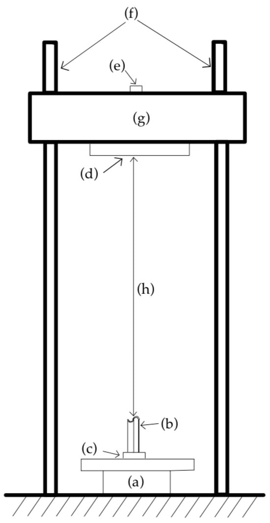 The impact tower test rig, also known as a drop tower, provides a cost-effective method to perform dynamic tests by impacting a specimen with a falling mass [40]. As seen in Figure 4, in this setup, a mass (g) is fixed to an impactor (d) at a predetermined height (h). The mass is released and guided by rails (f) to strike the specimen (b) at a certain velocity and energy. Accelerometers (e) are attached to the impactor to measure the acceleration during its descent and impact with the specimen, from which the force–displacement curve is obtained.