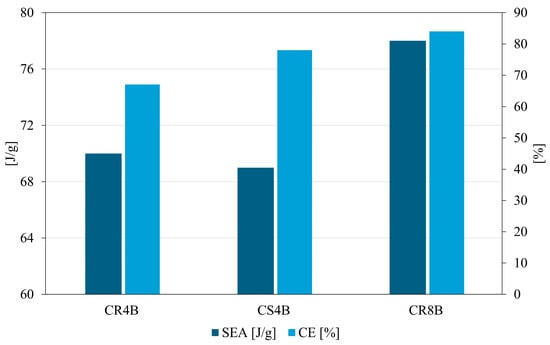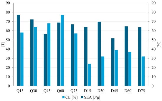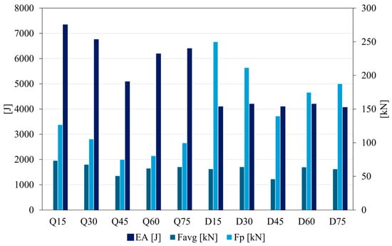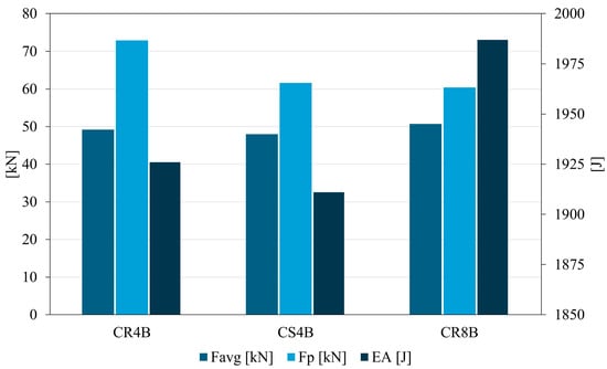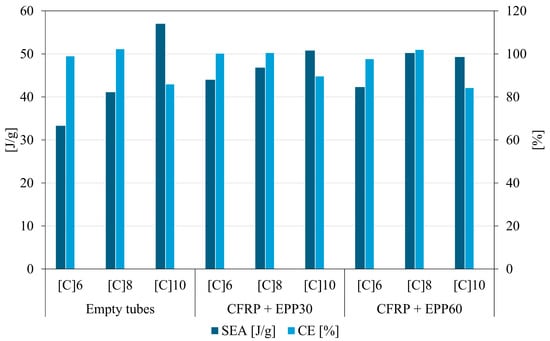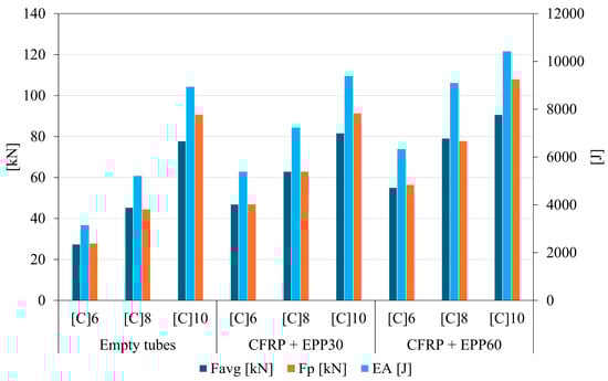 Özsoy et al. [57] studied the influence of expanded polypropylene foam on the crashworthiness of CFRP tube coupons, which had a diameter of 90 mm and a thickness of 2.2 mm. Polypropylene is a versatile material used in various applications, and its classification depends on its chemical properties and intended use. Depending on its formulation and curing process, polypropylene can function either as a matrix or a foam. This adaptability allows the polymer to be used in the form of expanded polypropylene (EPP), which can be specifically tailored for different functions, such as energy absorption in impact-resistant structures. The studied foam came in two different densities: 30 kg/m3 and 60 kg/m3, labelled as EPP30 and EPP60, respectively. The results from the study are summarised in Figure 6 and Figure 7.