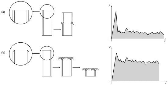 Integrated triggers are typically obtained by either reducing the laminate thickness in specific areas [58] or incorporating localised cut-outs. Among these methods, localised cut-outs are frequently employed. Additionally, other mechanically induced triggers are used, including bevels or chamfered tips [59], steeple triggers [60,61], tulip triggers [62], sawtooth patterns [21], and ply-drops [63]. These can be manufactured either after the curing cycle using machine tools or directly during the lamination process, properly cutting the plies to manufacture them [63].