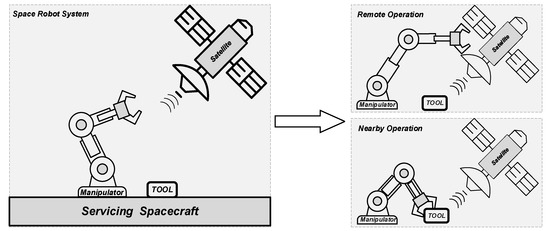The satellite life extension task is shown in Figure 1. The spacecraft equipped with a manipulator approaches the satellite and remains relatively stationary to it. Then the manipulator will work in a structured environment. The manipulator is defined as being in the Remote Operation mode during satellite operation. It needs to extend to avoid collision or electromagnetic interference caused by the spacecraft getting too close to the serviced satellite. The manipulator is defined as being in the Nearby Operation mode when changing tools. It needs to retract to enhance the operational precision and dexterity of the end-effector.