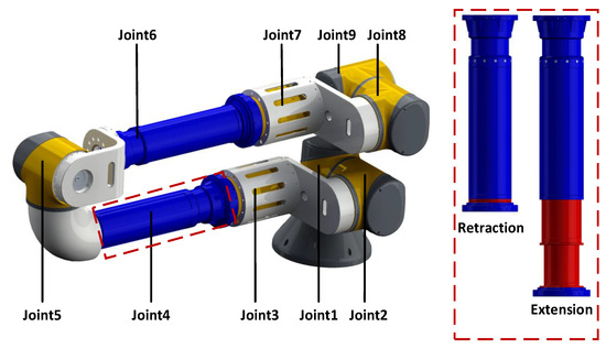 The design of a controllable telescopic space manipulator is shown in Figure 2. It consists of nine serial joints, with joints 4 and 6 as telescopic joints and others are rotational joints. The manipulator can dynamically adjust its telescopic lengths according to task requirements, enhancing its work capability and movement dexterity. However, the enhanced dexterity also makes the manipulator’s motion more complex.